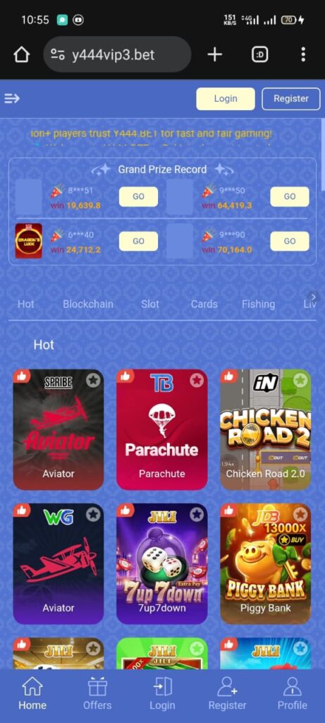 The Y444 platform hosts a wide range of casino and arcade games. You can choose from card games, slots, fish games, and crash games like Aviator and Plinko.